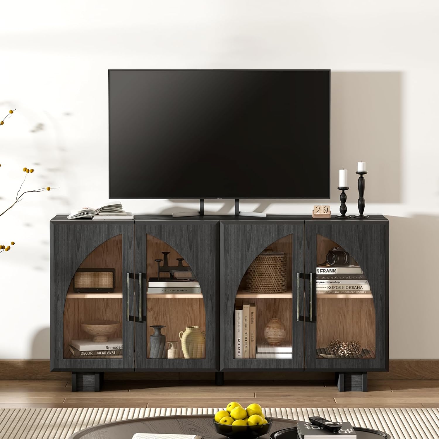 Sideboard Buffet Cabinet with Storage, 63" Large Arched Cabinet with Glass Doors, Mid Century Modern Buffet Table, Black Side Board for Living Room, Entryway, Kitchen